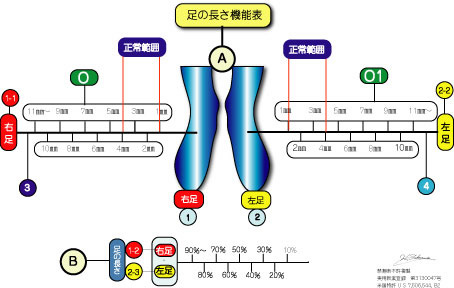 右の図は、足の長さを調べるものです。足の長さを調べれば、脳のどの部位に機能低下が現れているか、想像がつきます。自律神経の機能低下が読めるからです。つまり、頚椎の回旋がわかり脳神経の機能低下が読めるからです。