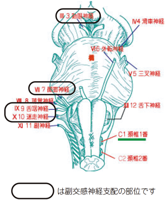 この脳幹は、脳神経が派生する重要な部位でもあります。この脳神経は、10本ありますが、副交感神経が支配している神経は、4本あります。脳神経3.7.9,10番です。イラストをご覧下さい。脳幹の大きさも模型で表示します。